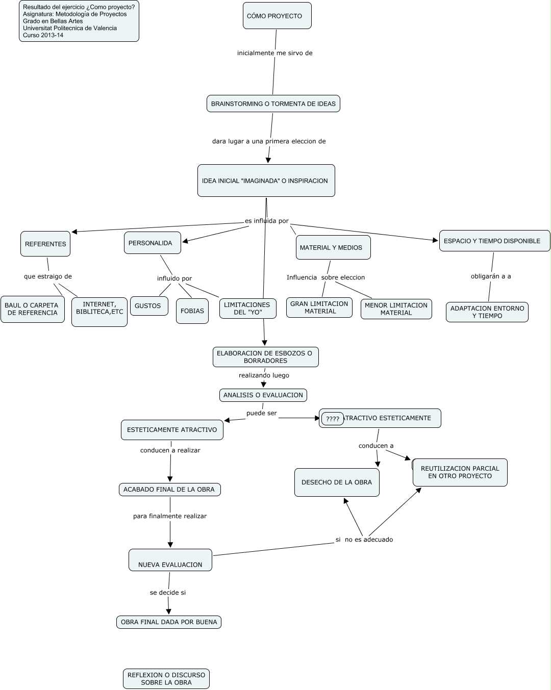 Este Cmap, tiene información relacionada con: Cómo proyecto Javier David Cataluña, REFERENTES que estraigo de INTERNET, BIBLITECA,ETC, ANALISIS O EVALUACION puede ser ????, ESPACIO Y TIEMPO DISPONIBLE obligarán a a ADAPTACION ENTORNO Y TIEMPO, ANALISIS O EVALUACION puede ser ESTETICAMENTE ATRACTIVO, IDEA INICIAL "IMAGINADA" O INSPIRACION es influida por PERSONALIDA, NUEVA EVALUACION si no es adecuado ????, REFERENTES que estraigo de BAUL O CARPETA DE REFERENCIA, ACABADO FINAL DE LA OBRA para finalmente realizar NUEVA EVALUACION, CÓMO PROYECTO inicialmente me sirvo de ????, PERSONALIDA influido por LIMITACIONES DEL "YO", MATERIAL Y MEDIOS Influencia sobre eleccion GRAN LIMITACION MATERIAL, NO ATRACTIVO ESTETICAMENTE conducen a ????, NUEVA EVALUACION si no es adecuado DESECHO DE LA OBRA, ESTETICAMENTE ATRACTIVO conducen a realizar ACABADO FINAL DE LA OBRA, PERSONALIDA influido por FOBIAS, ELABORACION DE ESBOZOS O BORRADORES realizando luego ANALISIS O EVALUACION, NUEVA EVALUACION se decide si OBRA FINAL DADA POR BUENA, BRAINSTORMING O TORMENTA DE IDEAS dara lugar a una primera eleccion de IDEA INICIAL "IMAGINADA" O INSPIRACION, MATERIAL Y MEDIOS Influencia sobre eleccion MENOR LIMITACION MATERIAL, IDEA INICIAL "IMAGINADA" O INSPIRACION es influida por REFERENTES