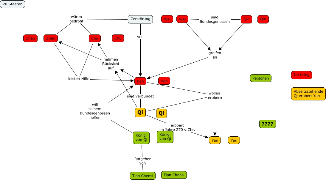 Dieses mit IHMC CmapTools erstellte CMap hat Informationen bezüglich: Strategem2, Qin greifen an Han, Zerstörung wären bedroht Zhao, Qin sind Bundesgenossen Wei, Zerstörung von Han, Zerstörung wären bedroht Chu, Han sind verbündet Qi, Zhao leisten Hilfe Han, Chu leisten Hilfe Han, Qi wollen erobern Yan, Qi König von Qi, Qi nehmen Rücksicht auf Zhao, König von Qi will seinem Bundesgenossen helfen Han, König von Qi Ratgeber von Tian Chensi, Wei greifen an Han, Qi erobert im Jahre 270 v.Chr. Yan, Han nehmen Rücksicht auf Chu, Han wollen erobern Yan, Han nehmen Rücksicht auf Zhao, Qi nehmen Rücksicht auf Chu