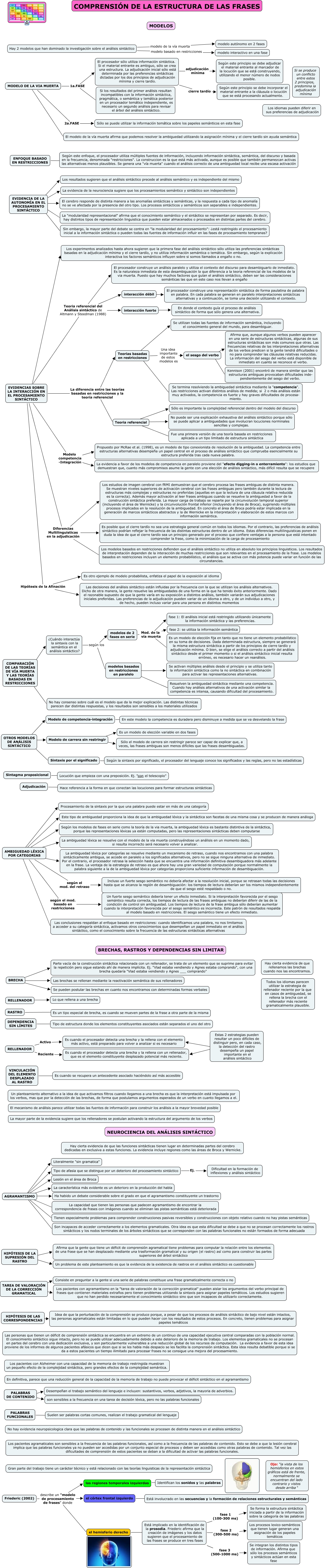 Este Cmap, tiene información relacionada con: MAPA_RESUMEN_PSICOLOGIA_LENGUAJE_7.2, HIPÓTESIS DE LA SUPRESIÓN DEL RASTRO ???? Un problema de este planteamiento es que la evidencia de la existencia de rastros en el análisis sintáctico es cuestionable, modelos de 2 fases en serie Mod. de la vía muerta fase 2: se utiliza la información semántica, RELLENADOR Reciente Es cuando el procesador detecta una brecha y la rellena con un rellenador, que es el elemento constituyente desplazado potencial más reciente., VINCULACIÓN DEL ELEMENTO DESPLAZADO AL RASTRO ???? Es cuando se recupera un antecedente asociado haciéndolo así más accesible, ENFOQUE BASADO EN RESTRICCIONES ???? Según este enfoque, el procesador utiliza múltiples fuentes de información, incluyendo información sintáctica, semántica, del discurso y basada en la frecuencia, denominada "restricciones". La construccion es la que está más activada, aunque es posible que también permanezcan activas las alternativas menos plausibles. Se genera una "vía muerta" cuando el análisis correcto de una ambiguedad local recibe una escasa activación, AGRAMANTISMO ???? La capacidad que tienen las personas que padecen agramantismo de encontrar la correspondencia de frases con imágenes cuando se eliminan las pistas semánticas está deteriorada, Friederic (2002) describe un "modelo de procesamiento de frases" donde las regiones temporales izquierdas, Teoria referencial ???? Fue una primera versión de una teoría basada en restricciones aplicada a un tipo limitado de estructura sintáctica, AGRAMANTISMO ???? Tipo de afasia que se distingue por un deterioro del procesamiento sintáctico, el hemisferio derecho ???? Está implicado en la identificación de la prosodia. Friederic afirma que la creación de imágenes y los datos sugieren que el procesamiento de las frases se produce en tres fases, EVIDENCIAS SOBRE LA INTERACCIÓN EN EL PROCESAMIENTO SINTÁCTICO Modelo competencia -Integración La evidencia a favor de los modelos de competencia en paralelo proviene del "efecto digging-in o enterramiento": los estudios que demuestran que, cuanto más compromisos asume la gente con una elección de análisis sintáctico, más difícil resulta que se recupere, AGRAMANTISMO ???? Tienen especialmente problemas para comprender construcciones pasivas reversibles y construcciones con objeto relativo cuando no hay pistas semánticas, el córtex frontal izquierdo ???? Está involucrado en las secuencias y la formación de relaciones estructurales y semánticas, interacción fuerte ???? En donde el contexto guía el proceso de análisis sintáctico de forma que sólo genera una alternativa., AMBIGUEDAD LÉXICA POR CATEGORIAS según el mod. basado en restricciones Un fuerte sesgo semántico debería tener un efecto inmediato. Si la interpretación favorecida por el sesgo semántico resulta correcta, los tiempos de lectura de las frases ambiguas no deberían diferir de las de la condición de control sin ambiguedad. Los tiempos de lectura de la frase ambigua sólo deberían aumentar cuando la interpretación favorecida por el sesgo semántico es incorrecta. Este patrón de resultados respalda al modelo basado en restricciones. El sesgo semántico tiene un efecto inmediato., AGRAMANTISMO ???? Ha habido un debate considerable sobre el grado en que el agramantismo constituyente un trastorno, Teoria referencial ???? Sólo es importante la complejidad referencial dentro del modelo del discurso, Hay 2 modelos que han dominado la investigación sobre el análisis sintáctico modelo basado en restricciones modelo interactivo en una fase, RELLENADOR ???? Lo que rellena a una brecha, AMBIGUEDAD LÉXICA POR CATEGORIAS según el mod. del retraso Incluso un fuerte sesgo semántico no debería afectar a la resolución inicial, porque se retrasan todas las decisiones hasta que se alcanza la región de desambiguación: los tiempos de lectura deberían ser los mismos independientemente de que el sesgo esté respaldado o no.