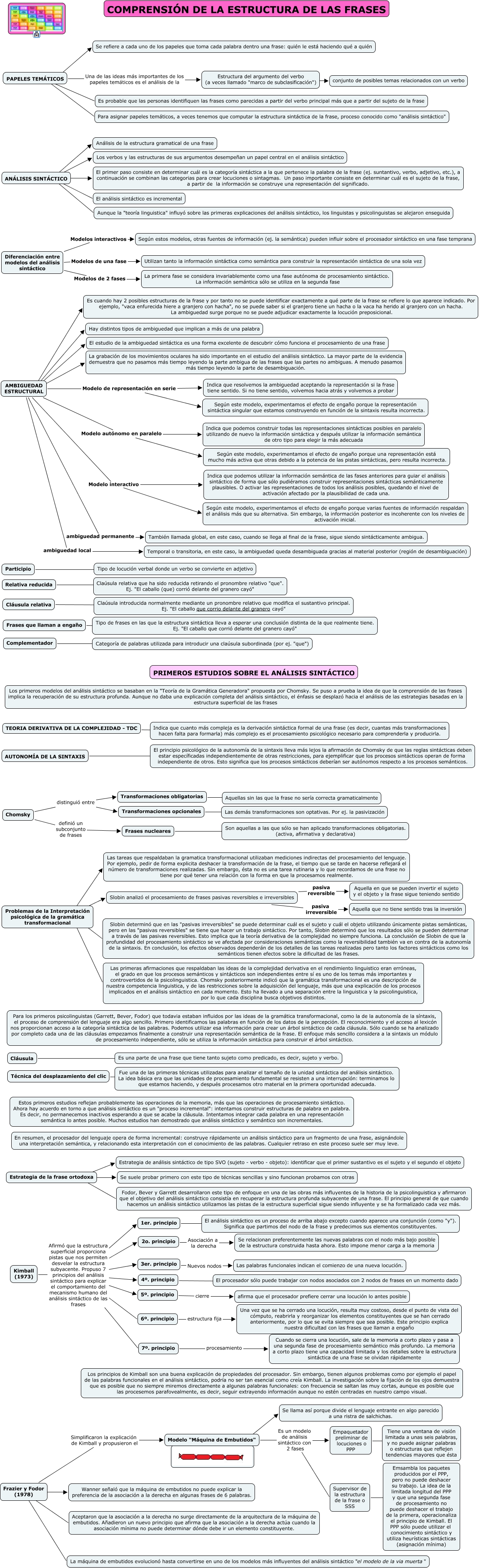 Este Cmap, tiene información relacionada con: MAPA_RESUMEN_PSICOLOGIA_LENGUAJE_7.1, Frazier y Fodor (1978) Simplificaron la explicación de Kimball y propusieron el Modelo "Máquina de Embutidos", Transformaciones obligatorias ???? Aquellas sin las que la frase no sería correcta gramaticalmente, ANÁLISIS SINTÁCTICO ???? Análisis de la estructura gramatical de una frase, AUTONOMÍA DE LA SINTAXIS ???? El principio psicológico de la autonomía de la sintaxis lleva más lejos la afirmación de Chomsky de que las reglas sintácticas deben estar específicadas independientemente de otras restricciones, para ejemplificar que los procesos sintácticos operan de forma independiente de otros. Esto significa que los procesos sintácticos deberían ser autónomos respecto a los procesos semánticos., 1er. principio ???? El análisis sintáctico es un proceso de arriba abajo excepto cuando aparece una conjunción (como "y"). Significa que partimos del nodo de la frase y predecimos sus elementos constituyentes., Frazier y Fodor (1978) ???? La máquina de embutidos evolucionó hasta convertirse en uno de los modelos más influyentes del análisis sintáctico "el modelo de la via muerta", Frases nucleares ???? Son aquellas a las que sólo se han aplicado transformaciones obligatorias. (activa, afirmativa y declarativa), 3er. principio Nuevos nodos Las palabras funcionales indican el comienzo de una nueva locución., Cláusula relativa ???? Claúsula introducida normalmente mediante un pronombre relativo que modifica el sustantivo principal. Ej. "El caballo que corrio delante del granero cayó", Complementador ???? Categoría de palabras utilizada para introducir una claúsula subordinada (por ej. "que"), Kimball (1973) Afirmó que la estructura superficial proporciona pistas que nos permiten desvelar la estructura subyacente. Propuso 7 principios del análisis sintáctico para explicar el comportamiento del mecanismo humano del análisis sintáctico de las frases 5º. principio, AMBIGUEDAD ESTRUCTURAL ???? Hay distintos tipos de ambiguedad que implican a más de una palabra, Kimball (1973) Afirmó que la estructura superficial proporciona pistas que nos permiten desvelar la estructura subyacente. Propuso 7 principios del análisis sintáctico para explicar el comportamiento del mecanismo humano del análisis sintáctico de las frases 2o. principio, Problemas de la Interpretación psicológica de la gramática transformacional ???? Las primeras afirmaciones que respaldaban las ideas de la complejidad derivativa en el rendimiento linguistico eran erróneas, el grado en que los procesos semánticos y sintácticos son independientes entre sí es uno de los temas más importantes y controvertidos de la psicolinguistica. Chomsky posteriormente indicó que la gramática transformacional es una descripción de nuestra competencia linguistica, y de las restricciones sobre la adquisición del lenguaje, más que una explicación de los procesos implicados en el análisis sintáctico en cada momento. Esto ha llevado a una separación entre la linguistica y la psicolinguistica, por lo que cada disciplina busca objetivos distintos., Relativa reducida ???? Claúsula relativa que ha sido reducida retirando el pronombre relativo "que". Ej. "El caballo (que) corrió delante del granero cayó", TEORIA DERIVATIVA DE LA COMPLEJIDAD - TDC ???? Indica que cuanto más compleja es la derivación sintáctica formal de una frase (es decir, cuantas más transformaciones hacen falta para formarla) más complejo es el procesamiento psicológico necesario para comprenderla y producirla., Kimball (1973) Afirmó que la estructura superficial proporciona pistas que nos permiten desvelar la estructura subyacente. Propuso 7 principios del análisis sintáctico para explicar el comportamiento del mecanismo humano del análisis sintáctico de las frases 7º. principio, Problemas de la Interpretación psicológica de la gramática transformacional ???? Las tareas que respaldaban la gramatica transformacional utilizaban mediciones indirectas del procesamiento del lenguaje. Por ejemplo, pedir de forma explicita deshacer la transformación de la frase, el tiempo que se tarde en hacerse reflejará el número de transformaciones realizadas. Sin embargo, ésta no es una tarea rutinaria y lo que recordamos de una frase no tiene por qué tener una relación con la forma en que la procesamos realmente., Participio ???? Tipo de locución verbal donde un verbo se convierte en adjetivo, AMBIGUEDAD ESTRUCTURAL ambiguedad permanente También llamada global, en este caso, cuando se llega al final de la frase, sigue siendo sintácticamente ambigua.