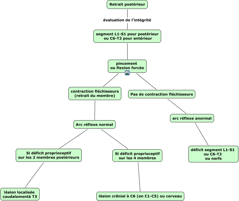 Cette carte de concepts créée avec IHMC CmapTools traite de: réflexe postérieur et ant, segment L1-S1 pour postérieur ou C6-T2 pour antérieur pincement ou flexion forcée, pincement ou flexion forcée contraction fléchisseurs (retrait du membre), Arc réflexe normal Si déficit proprioceptif sur les 2 membres postérieurs, arc réflexe anormal déficit segment L1-S1 ou C6-T2 ou nerfs, Retrait postérieur évaluation de l'intégrité segment L1-S1 pour postérieur ou C6-T2 pour antérieur, Si déficit proprioceptif sur les 4 membres lésion crânial à C6 (en C1-C5) ou cerveau, Pas de contraction fléchisseurs arc réflexe anormal, Si déficit proprioceptif sur les 2 membres postérieurs lésion localisée caudalementà T3, contraction fléchisseurs (retrait du membre) Arc réflexe normal, Arc réflexe normal Si déficit proprioceptif sur les 4 membres, pincement ou flexion forcée Pas de contraction fléchisseurs