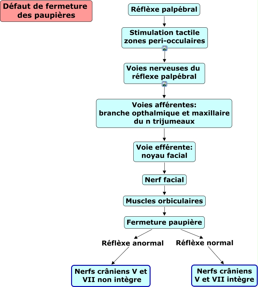 Cette carte de concepts créée avec IHMC CmapTools traite de: réflex palpébral, Réflèxe palpébral Stimulation tactile zones peri-occulaires, Nerf facial Muscles orbiculaires, Muscles orbiculaires Fermeture paupière, Voie efférente: noyau facial Nerf facial, Voies nerveuses du réflexe palpébral Voies afférentes: branche opthalmique et maxillaire du n trijumeaux, Stimulation tactile zones peri-occulaires Voies nerveuses du réflexe palpébral, Fermeture paupière Réflèxe normal Nerfs crâniens V et VII intègre, Fermeture paupière Réflèxe anormal Nerfs crâniens V et VII non intègre, Voies afférentes: branche opthalmique et maxillaire du n trijumeaux Voie efférente: noyau facial