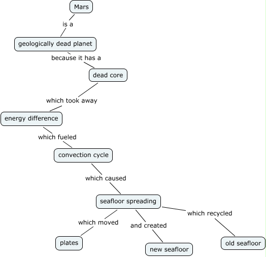 This Concept Map, created with IHMC CmapTools, has information related to: Tectonic Mars, seafloor spreading which moved plates, seafloor spreading which recycled old seafloor, dead core which took away energy difference, seafloor spreading and created new seafloor, geologically dead planet because it has a dead core, convection cycle which caused seafloor spreading, energy difference which fueled convection cycle, Mars is a geologically dead planet