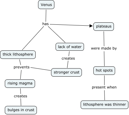 This Concept Map, created with IHMC CmapTools, has information related to: Tectonic Venus, Venus has thick lithosphere, Venus has plateaus, rising magma creates bulges in crust, Venus has lack of water, hot spots present when lithosphere was thinner, plateaus were made by hot spots, thick lithosphere prevents rising magma, stronger crust prevents rising magma, lack of water creates stronger crust