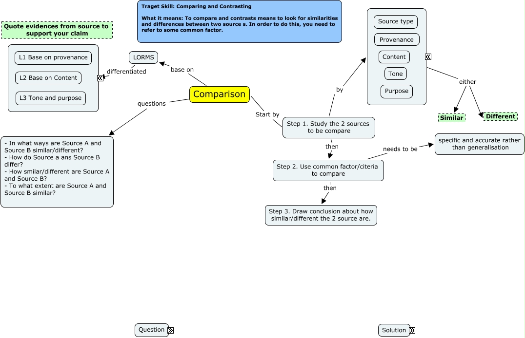 This Concept Map, created with IHMC CmapTools, has information related to: 0_SS skills comparison, Step 1. Study the 2 sources to be compare by Source, Comparison base on LORMS, Step 2. Use common factor/citeria to compare needs to be specific and accurate rather than generalisation, Source either Different, Comparison Start by Step 1. Study the 2 sources to be compare, LORMS differentiated ????, Step 1. Study the 2 sources to be compare then Step 2. Use common factor/citeria to compare, Source either Similar, Comparison questions - In what ways are Source A and Source B similar/different? - How do Source a ans Source B differ? - How smilar/different are Source A and Source B? - To what extent are Source A and Source B similar?, Step 2. Use common factor/citeria to compare then Step 3. Draw conclusion about how similar/different the 2 source are.