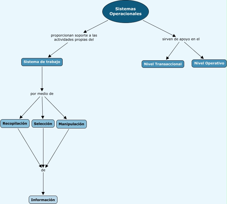 Este Cmap, tiene información relacionada con: Sistemas Operacionales, Sistemas Operacionales proporcionan soporte a las actividades propias del Sistema de trabajo, Sistemas Operacionales sirven de apoyo en el Nivel Transaccional, Sistemas Operacionales sirven de apoyo en el Nivel Operativo, Selección de Información, Sistema de trabajo por medio de Selección, Manipulación de Información, Recopilación de Información, Sistema de trabajo por medio de Manipulación, Sistema de trabajo por medio de Recopilación