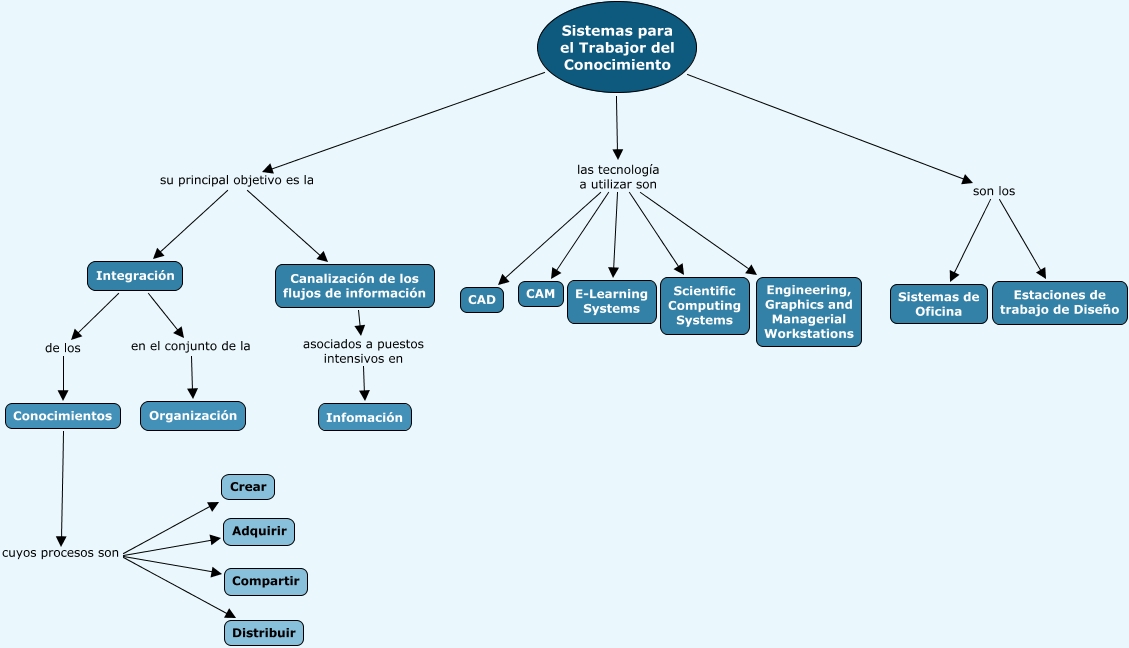 Este Cmap, tiene información relacionada con: Sistemas para el Trabajador del Conocimiento, Conocimientos cuyos procesos son Compartir, Sistemas para el Trabajor del Conocimiento las tecnología a utilizar son CAM, Integración de los Conocimientos, Canalización de los flujos de información asociados a puestos intensivos en Infomación, Integración en el conjunto de la Organización, Sistemas para el Trabajor del Conocimiento su principal objetivo es la Canalización de los flujos de información, Sistemas para el Trabajor del Conocimiento son los Sistemas de Oficina, Conocimientos cuyos procesos son Adquirir, Conocimientos cuyos procesos son Distribuir, Sistemas para el Trabajor del Conocimiento las tecnología a utilizar son Engineering, Graphics and Managerial Workstations, Sistemas para el Trabajor del Conocimiento las tecnología a utilizar son Scientific Computing Systems, Sistemas para el Trabajor del Conocimiento su principal objetivo es la Integración, Sistemas para el Trabajor del Conocimiento las tecnología a utilizar son CAD, Conocimientos cuyos procesos son Crear, Sistemas para el Trabajor del Conocimiento son los Estaciones de trabajo de Diseño, Sistemas para el Trabajor del Conocimiento las tecnología a utilizar son E-Learning Systems