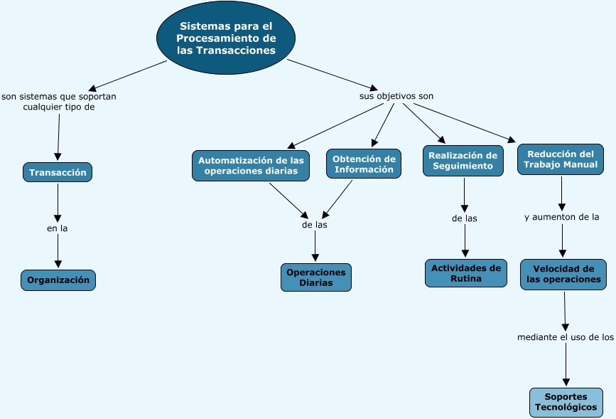 Este Cmap, tiene información relacionada con: Sistemas para el Procesamiento de las Transacciones, Automatización de las operaciones diarias de las Operaciones Diarias, Sistemas para el Procesamiento de las Transacciones sus objetivos son Automatización de las operaciones diarias, Sistemas para el Procesamiento de las Transacciones sus objetivos son Reducción del Trabajo Manual, Sistemas para el Procesamiento de las Transacciones sus objetivos son Realización de Seguimiento, Transacción en la Organización, Realización de Seguimiento de las Actividades de Rutina, Sistemas para el Procesamiento de las Transacciones sus objetivos son Obtención de Información, Sistemas para el Procesamiento de las Transacciones son sistemas que soportan cualquier tipo de Transacción, Velocidad de las operaciones mediante el uso de los Soportes Tecnológicos, Reducción del Trabajo Manual y aumenton de la Velocidad de las operaciones, Obtención de Información de las Operaciones Diarias