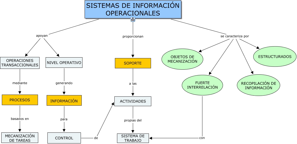 Este Cmap, tiene información relacionada con: SI Operacionales, SISTEMAS DE INFORMACIÓN OPERACIONALES apoyan NIVEL OPERATIVO, SISTEMAS DE INFORMACIÓN OPERACIONALES se caracteriza por OBJETOS DE MECANIZACIÓN, SISTEMAS DE INFORMACIÓN OPERACIONALES apoyan OPERACIONES TRANSACCIONALES, PROCESOS basados en MECANIZACIÓN DE TAREAS, NIVEL OPERATIVO generando INFORMACIÓN, OPERACIONES TRANSACCIONALES mediante PROCESOS, SOPORTE a las ACTIVIDADES, SISTEMAS DE INFORMACIÓN OPERACIONALES se caracteriza por FUERTE INTERRELACIÓN, SISTEMAS DE INFORMACIÓN OPERACIONALES se caracteriza por ESTRUCTURADOS, SISTEMAS DE INFORMACIÓN OPERACIONALES se caracteriza por RECOPILACIÓN DE INFORMACIÓN, SISTEMAS DE INFORMACIÓN OPERACIONALES proporcionan SOPORTE, ACTIVIDADES propias del SISTEMA DE TRABAJO, INFORMACIÓN para CONTROL, CONTROL de ACTIVIDADES, FUERTE INTERRELACIÓN con SISTEMA DE TRABAJO