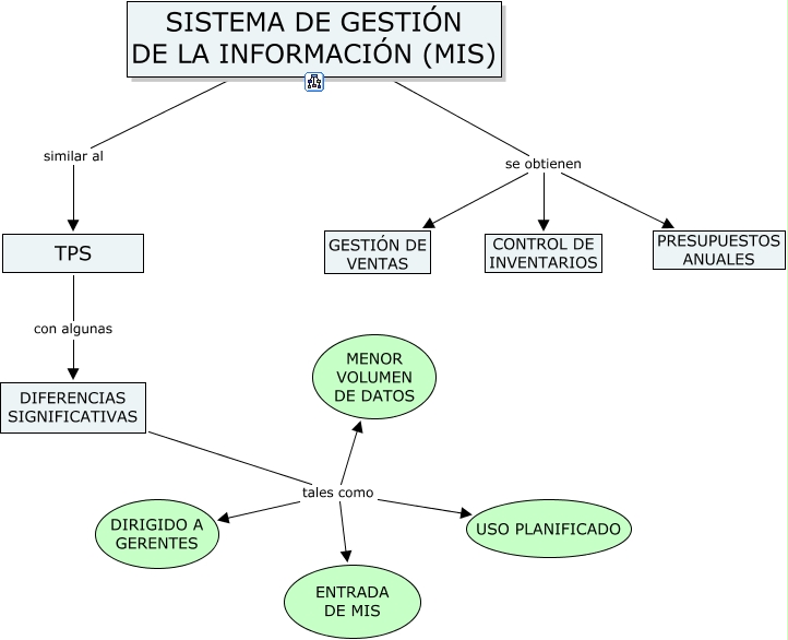Este Cmap, tiene información relacionada con: MIS, DIFERENCIAS SIGNIFICATIVAS tales como ENTRADA DE MIS, SISTEMA DE GESTIÓN DE LA INFORMACIÓN (MIS) se obtienen GESTIÓN DE VENTAS, DIFERENCIAS SIGNIFICATIVAS tales como DIRIGIDO A GERENTES, TPS con algunas DIFERENCIAS SIGNIFICATIVAS, SISTEMA DE GESTIÓN DE LA INFORMACIÓN (MIS) se obtienen CONTROL DE INVENTARIOS, SISTEMA DE GESTIÓN DE LA INFORMACIÓN (MIS) similar al TPS, SISTEMA DE GESTIÓN DE LA INFORMACIÓN (MIS) se obtienen PRESUPUESTOS ANUALES, DIFERENCIAS SIGNIFICATIVAS tales como USO PLANIFICADO, DIFERENCIAS SIGNIFICATIVAS tales como MENOR VOLUMEN DE DATOS