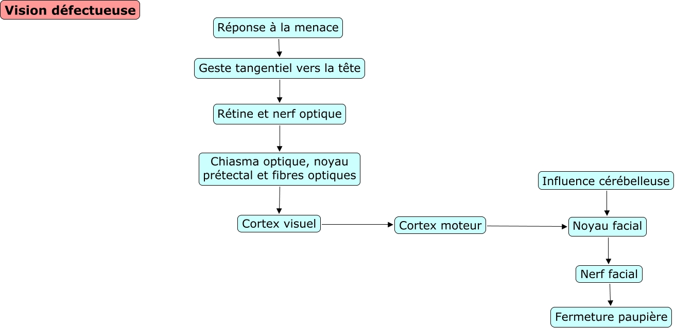 Cette carte de concepts créée avec IHMC CmapTools traite de: réponse de menace, Chiasma optique, noyau prétectal et fibres optiques Cortex visuel, Rétine et nerf optique Chiasma optique, noyau prétectal et fibres optiques, Influence cérébelleuse Noyau facial, Noyau facial Nerf facial, Nerf facial Fermeture paupière, Geste tangentiel vers la tête Rétine et nerf optique, Réponse à la menace Geste tangentiel vers la tête, Cortex visuel Cortex moteur, Cortex moteur Noyau facial