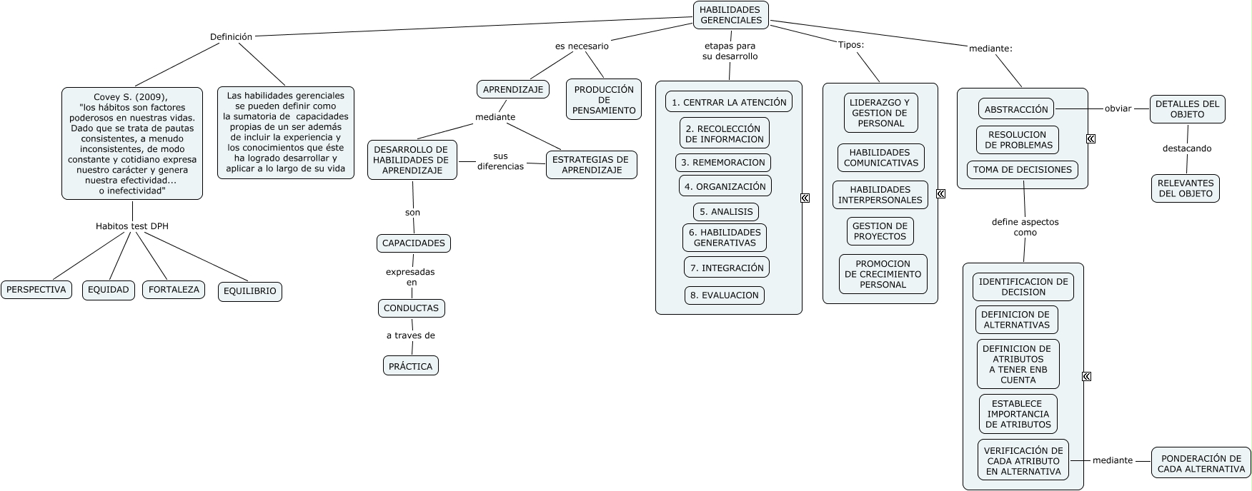 Este Cmap, tiene información relacionada con: habilidades GERENCIALES, Covey S. (2009), "los hábitos son factores poderosos en nuestras vidas. Dado que se trata de pautas consistentes, a menudo inconsistentes, de modo constante y cotidiano expresa nuestro carácter y genera nuestra efectividad... o inefectividad" Habitos test DPH EQUILIBRIO, APRENDIZAJE mediante DESARROLLO DE HABILIDADES DE APRENDIZAJE, VERIFICACIÓN DE CADA ATRIBUTO EN ALTERNATIVA mediante PONDERACIÓN DE CADA ALTERNATIVA, HABILIDADES GERENCIALES Definición Las habilidades gerenciales se pueden definir como la sumatoria de capacidades propias de un ser además de incluir la experiencia y los conocimientos que éste ha logrado desarrollar y aplicar a lo largo de su vida, TOMA DE DECISIONES define aspectos como ????, HABILIDADES GERENCIALES mediante: ????, HABILIDADES GERENCIALES Tipos: ????, CONDUCTAS a traves de PRÁCTICA, HABILIDADES GERENCIALES etapas para su desarrollo ????, CAPACIDADES expresadas en CONDUCTAS, HABILIDADES GERENCIALES es necesario PRODUCCIÓN DE PENSAMIENTO, DESARROLLO DE HABILIDADES DE APRENDIZAJE sus diferencias ESTRATEGIAS DE APRENDIZAJE, DETALLES DEL OBJETO destacando RELEVANTES DEL OBJETO, Covey S. (2009), "los hábitos son factores poderosos en nuestras vidas. Dado que se trata de pautas consistentes, a menudo inconsistentes, de modo constante y cotidiano expresa nuestro carácter y genera nuestra efectividad... o inefectividad" Habitos test DPH FORTALEZA, Covey S. (2009), "los hábitos son factores poderosos en nuestras vidas. Dado que se trata de pautas consistentes, a menudo inconsistentes, de modo constante y cotidiano expresa nuestro carácter y genera nuestra efectividad... o inefectividad" Habitos test DPH EQUIDAD, Covey S. (2009), "los hábitos son factores poderosos en nuestras vidas. Dado que se trata de pautas consistentes, a menudo inconsistentes, de modo constante y cotidiano expresa nuestro carácter y genera nuestra efectividad... o inefectividad" Habitos test DPH PERSPECTIVA, HABILIDADES GERENCIALES es necesario APRENDIZAJE, HABILIDADES GERENCIALES Definición Covey S. (2009), "los hábitos son factores poderosos en nuestras vidas. Dado que se trata de pautas consistentes, a menudo inconsistentes, de modo constante y cotidiano expresa nuestro carácter y genera nuestra efectividad... o inefectividad", DESARROLLO DE HABILIDADES DE APRENDIZAJE son CAPACIDADES, ABSTRACCIÓN obviar DETALLES DEL OBJETO