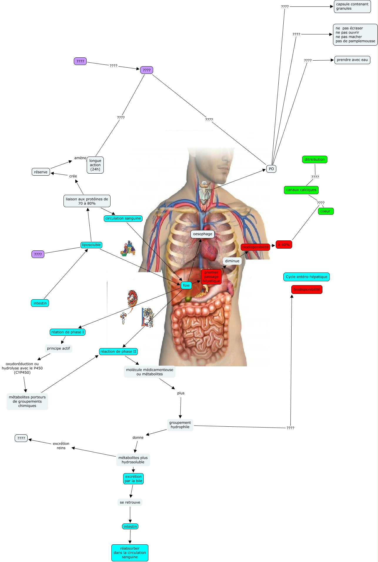 Cette carte de concepts créée avec IHMC CmapTools traite de: cardizem, foie réation de phase I principe actif, ditrsibution ???? canaux calciques, PO ???? prendre avec eau, foie o oesophage, diminue biodisponibilité à 40%, ???? liposoluble liaison aux protéines de 70 à 80%, oesophage ???? PO, liaison aux protéines de 70 à 80% circulation sanguine foie, ???? ???? ????, se retrouve intestin réabsorber dans la circulation sanguine, molécule médicamenteuse ou métabolites plus groupement hydrophile, foie réaction de phase II molécule médicamenteuse ou métabolites, foie premier passage hépatique diminue, canaux calciques ???? coeur, PO ???? capsule contenant granules, principe actif oxydoréduction ou hydrolyse avec le P450 (CYP450) métabolites porteurs de groupements chimiques, PO ???? ne pas écraser ne pas ouvrir ne pas macher pas de pamplemousse, intestin liposoluble foie, métabolites plus hydrosoluble excrétion par la bile se retrouve, ???? ???? PO