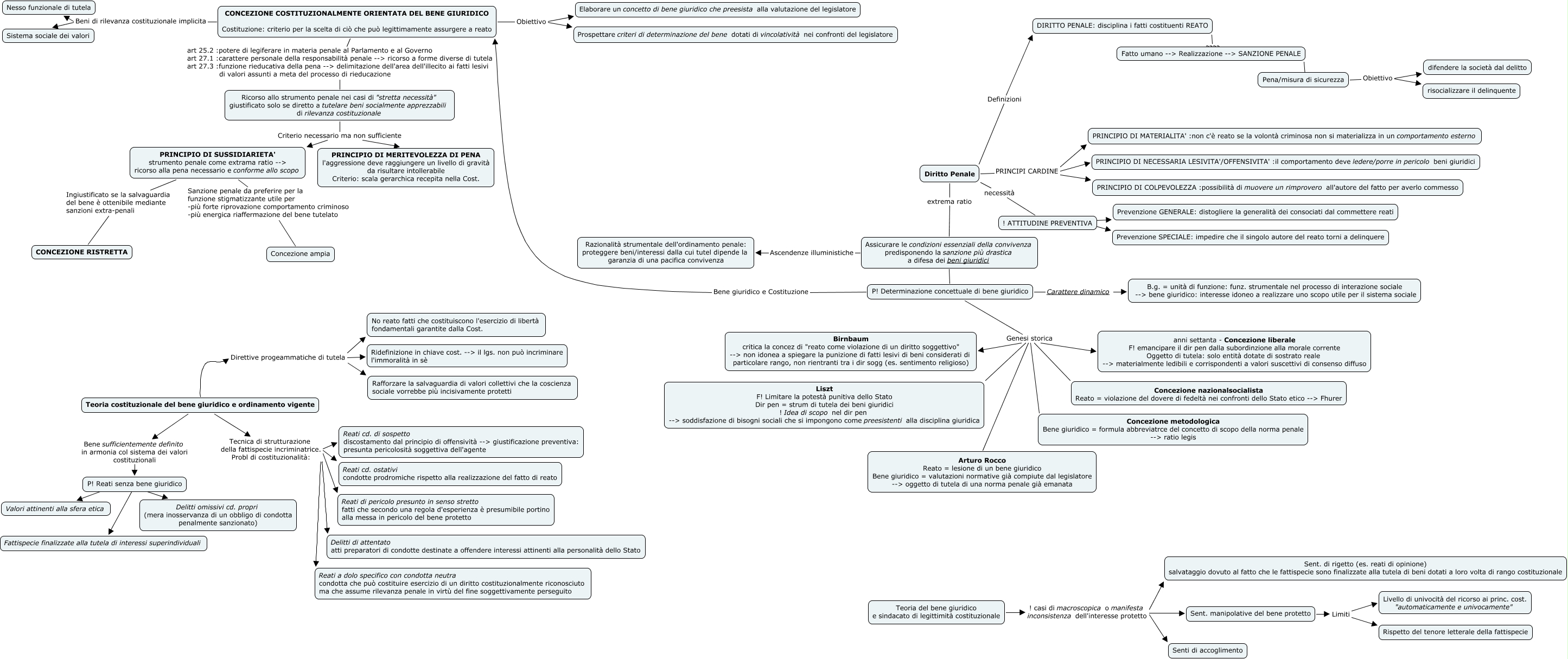 Questa Cmap, creata con IHMC CmapTools, contiene informazioni relative a: 1 - Diritto penale, P! Determinazione concettuale di bene giuridico Genesi storica Birnbaum critica la concez di "reato come violazione di un diritto soggettivo" --> non idonea a spiegare la punizione di fatti lesivi di beni considerati di particolare rango, non rientranti tra i dir sogg (es. sentimento religioso), CONCEZIONE COSTITUZIONALMENTE ORIENTATA DEL BENE GIURIDICO Costituzione: criterio per la scelta di ciò che può legittimamente assurgere a reato Beni di rilevanza costituzionale implicita Sistema sociale dei valori, ! ATTITUDINE PREVENTIVA ???? Prevenzione SPECIALE: impedire che il singolo autore del reato torni a delinquere, Pena/misura di sicurezza Obiettivo risocializzare il delinquente, P! Reati senza bene giuridico ???? Fattispecie finalizzate alla tutela di interessi superindividuali, P! Determinazione concettuale di bene giuridico Genesi storica anni settanta - Concezione liberale F! emancipare il dir pen dalla subordinzione alla morale corrente Oggetto di tutela: solo entità dotate di sostrato reale --> materialmente ledibili e corrispondenti a valori suscettivi di consenso diffuso, Teoria costituzionale del bene giuridico e ordinamento vigente Direttive progeammatiche di tutela Rafforzare la salvaguardia di valori collettivi che la coscienza sociale vorrebbe più incisivamente protetti, P! Determinazione concettuale di bene giuridico Genesi storica Concezione nazionalsocialista Reato = violazione del dovere di fedeltà nei confronti dello Stato etico --> Fhurer, Diritto Penale PRINCIPI CARDINE PRINCIPIO DI MATERIALITA' :non c'è reato se la volontà criminosa non si materializza in un comportamento esterno, Teoria costituzionale del bene giuridico e ordinamento vigente Tecnica di strutturazione della fattispecie incriminatrice. Probl di costituzionalità: Reati cd. di sospetto discostamento dal principio di offensività --> giustificazione preventiva: presunta pericolosità soggettiva dell'agente, Teoria costituzionale del bene giuridico e ordinamento vigente Tecnica di strutturazione della fattispecie incriminatrice. Probl di costituzionalità: Reati cd. ostativi condotte prodromiche rispetto alla realizzazione del fatto di reato, CONCEZIONE COSTITUZIONALMENTE ORIENTATA DEL BENE GIURIDICO Costituzione: criterio per la scelta di ciò che può legittimamente assurgere a reato Obiettivo Prospettare criteri di determinazione del bene dotati di vincolatività nei confronti del legislatore, Teoria costituzionale del bene giuridico e ordinamento vigente Tecnica di strutturazione della fattispecie incriminatrice. Probl di costituzionalità: Reati a dolo specifico con condotta neutra condotta che può costituire esercizio di un diritto costituzionalmente riconosciuto ma che assume rilevanza penale in virtù del fine soggettivamente perseguito, Diritto Penale Definizioni DIRITTO PENALE: disciplina i fatti costituenti REATO, Pena/misura di sicurezza Obiettivo difendere la società dal delitto, Teoria costituzionale del bene giuridico e ordinamento vigente Direttive progeammatiche di tutela No reato fatti che costituiscono l'esercizio di libertà fondamentali garantite dalla Cost., P! Determinazione concettuale di bene giuridico Bene giuridico e Costituzione CONCEZIONE COSTITUZIONALMENTE ORIENTATA DEL BENE GIURIDICO Costituzione: criterio per la scelta di ciò che può legittimamente assurgere a reato, Teoria costituzionale del bene giuridico e ordinamento vigente Tecnica di strutturazione della fattispecie incriminatrice. Probl di costituzionalità: Reati di pericolo presunto in senso stretto fatti che secondo una regola d'esperienza è presumibile portino alla messa in pericolo del bene protetto, Assicurare le condizioni essenziali della convivenza predisponendo la sanzione più drastica a difesa dei beni giuridici Ascendenze illuministiche Razionalità strumentale dell'ordinamento penale: proteggere beni/interessi dalla cui tutel dipende la garanzia di una pacifica convivenza, Teoria del bene giuridico e sindacato di legittimità costituzionale ! casi di macroscopica o manifesta inconsistenza dell'interesse protetto Sent. manipolative del bene protetto