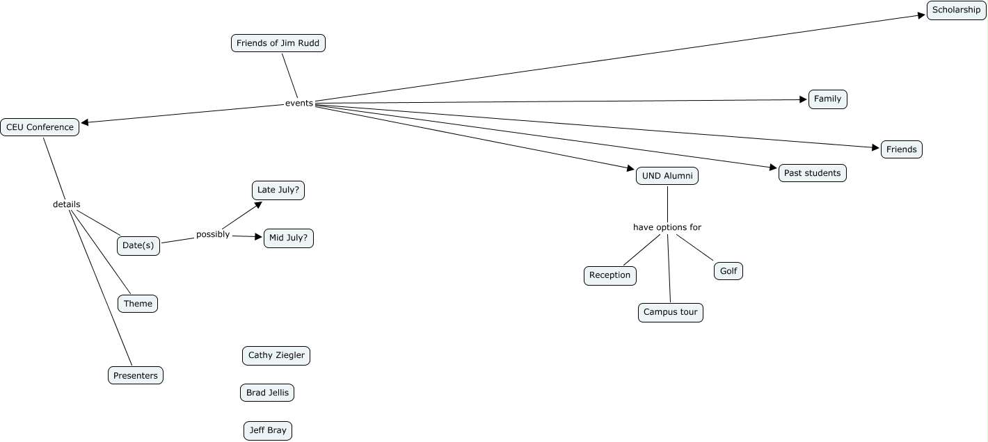 This Concept Map, created with IHMC CmapTools, has information related to: Friends of Jim Rudd, UND Alumni have options for Golf, UND Alumni have options for Campus tour, Friends of Jim Rudd events Family, UND Alumni have options for Reception, Friends of Jim Rudd events Scholarship, Friends of Jim Rudd events Past students, CEU Conference details Date(s), Friends of Jim Rudd events CEU Conference, CEU Conference details Theme, CEU Conference details Presenters, Date(s) possibly Mid July?, Friends of Jim Rudd events UND Alumni, Friends of Jim Rudd events Friends, Date(s) possibly Late July?