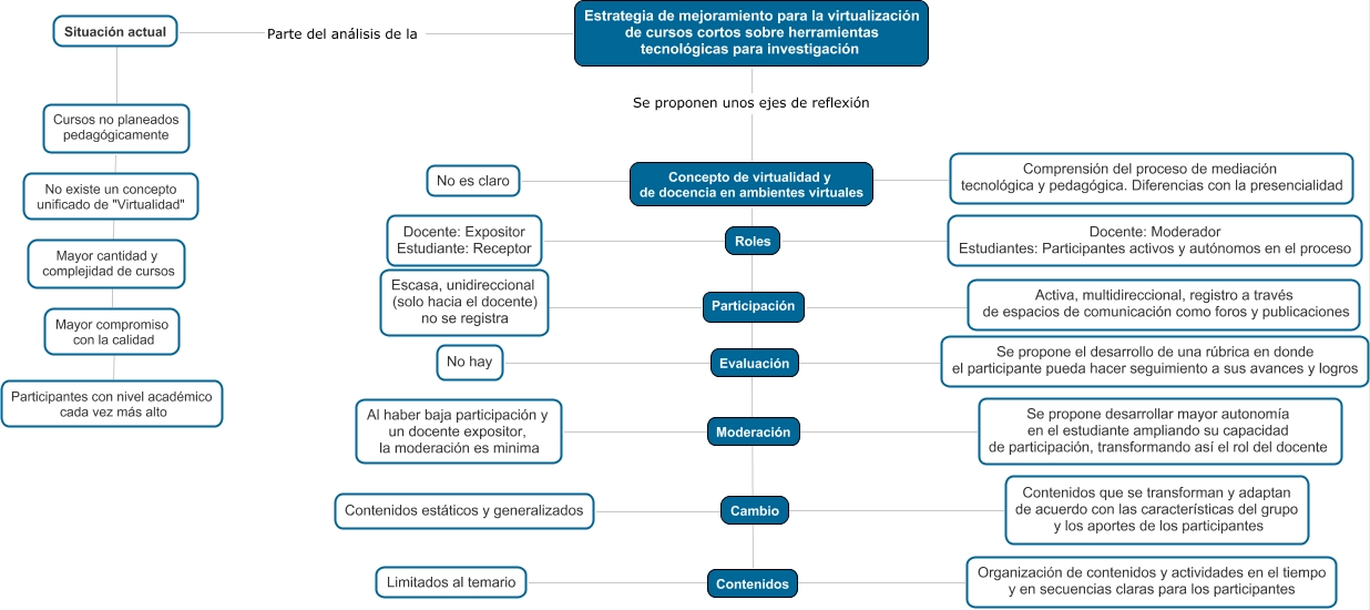 Este Cmap, tiene información relacionada con: Propuesta de Intervención, Cursos no planeados pedagógicamente ???? Mayor compromiso con la calidad, Participación ???? Escasa, unidireccional (solo hacia el docente) no se registra, Roles ???? Docente: Expositor Estudiante: Receptor, Moderación ???? Al haber baja participación y un docente expositor, la moderación es minima, Evaluación ???? No hay, Estrategia de mejoramiento para la virtualización de cursos cortos sobre herramientas tecnológicas para investigación Se proponen unos ejes de reflexión Concepto de virtualidad y de docencia en ambientes virtuales, Concepto de virtualidad y de docencia en ambientes virtuales ???? Contenidos, Concepto de virtualidad y de docencia en ambientes virtuales ???? Comprensión del proceso de mediación tecnológica y pedagógica. Diferencias con la presencialidad, Participación ???? Activa, multidireccional, registro a través de espacios de comunicación como foros y publicaciones, Situación actual ???? Cursos no planeados pedagógicamente, Contenidos ???? Limitados al temario, Concepto de virtualidad y de docencia en ambientes virtuales ???? No es claro, Evaluación ???? Se propone el desarrollo de una rúbrica en donde el participante pueda hacer seguimiento a sus avances y logros, Cambio ???? Contenidos estáticos y generalizados, Cambio ???? Contenidos que se transforman y adaptan de acuerdo con las características del grupo y los aportes de los participantes, Estrategia de mejoramiento para la virtualización de cursos cortos sobre herramientas tecnológicas para investigación Parte del análisis de la Situación actual, Roles ???? Docente: Moderador Estudiantes: Participantes activos y autónomos en el proceso, Contenidos ???? Organización de contenidos y actividades en el tiempo y en secuencias claras para los participantes, Moderación ???? Se propone desarrollar mayor autonomía en el estudiante ampliando su capacidad de participación, transformando así el rol del docente, Mayor compromiso con la calidad ???? Participantes con nivel académico cada vez más alto