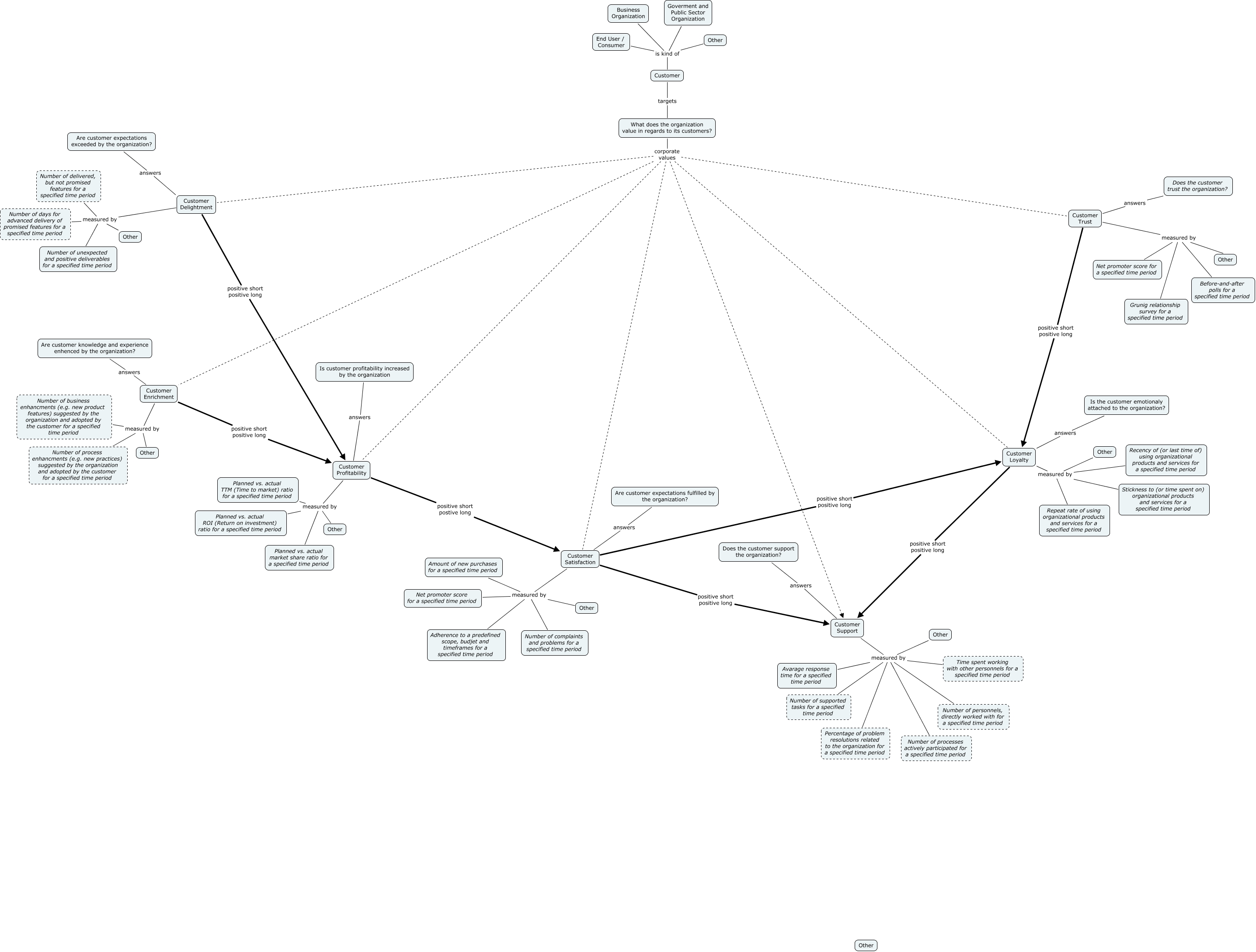 This Concept Map, created with IHMC CmapTools, has information related to: Customer, Customer Profitability positive short postive long Customer Satisfaction, Customer Loyalty measured by Stickness to (or time spent on) organizational products and services for a specified time period, Business Organization is kind of Customer, Customer Satisfaction measured by Amount of new purchases for a specified time period, End User / Consumer is kind of Customer, What does the organization value in regards to its customers? corporate values Customer Delightment, Customer Profitability measured by Planned vs. actual TTM (Time to market) ratio for a specified time period, What does the organization value in regards to its customers? corporate values Customer Loyalty, Customer Support measured by Number of supported tasks for a specified time period, What does the organization value in regards to its customers? corporate values Customer Satisfaction, Customer Support answers Does the customer support the organization?, Customer Satisfaction positive short positive long Customer Loyalty, Goverment and Public Sector Organization is kind of Customer, Customer Support measured by Percentage of problem resolutions related to the organization for a specified time period, Customer Support measured by Number of personnels, directly worked with for a specified time period, Customer Support measured by Other, Customer Delightment measured by Number of delivered, but not promised features for a specified time period, Customer Support measured by Number of processes actively participated for a specified time period, Other is kind of Customer, Customer Satisfaction measured by Adherence to a predefined scope, budjet and timeframes for a specified time period