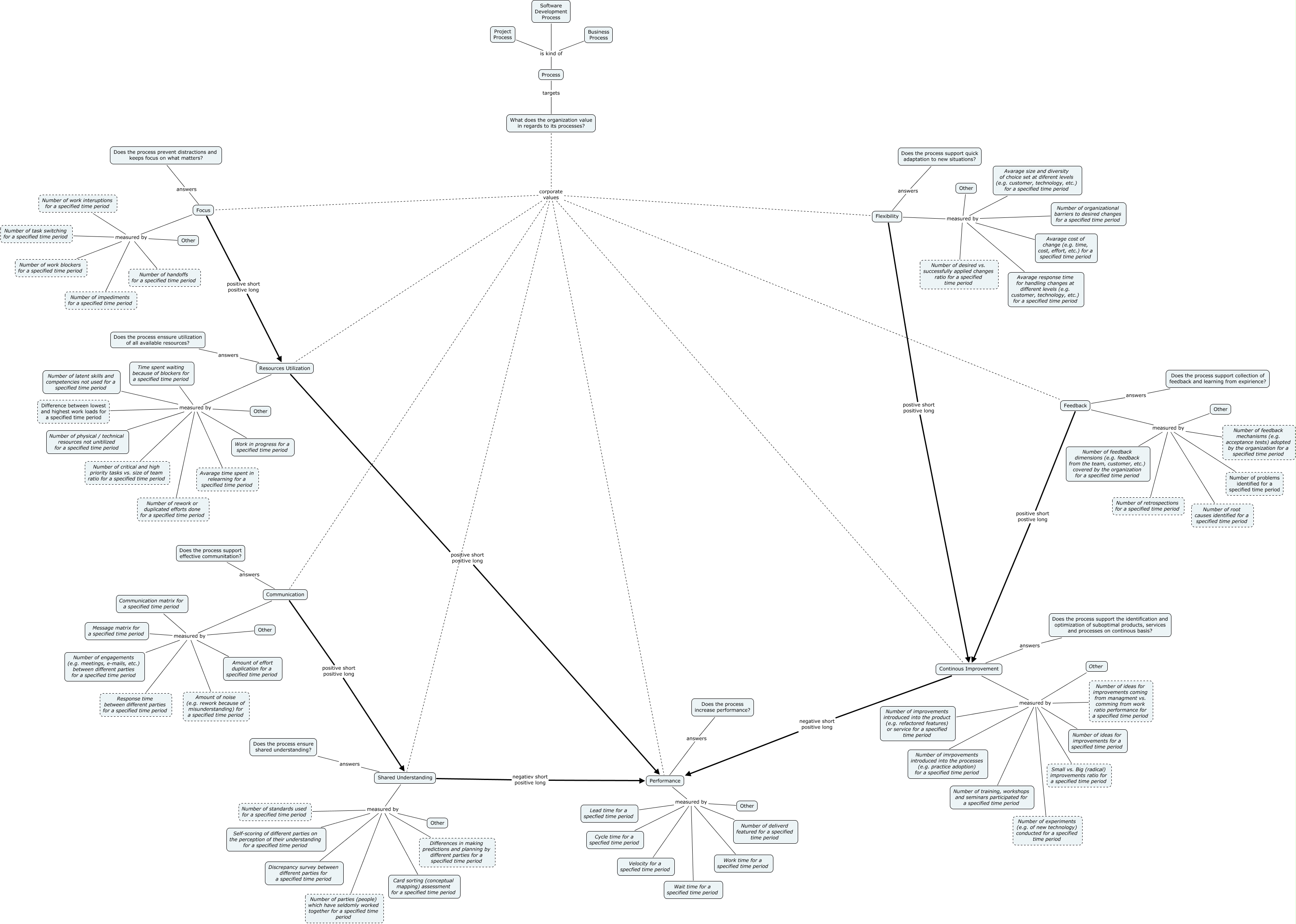 This Concept Map, created with IHMC CmapTools, has information related to: Process, Communication measured by Message matrix for a specified time period, Resources Utilization measured by Work in progress for a specified time period, Performance measured by Velocity for a specfied time period, Feedback measured by Number of root causes identified for a specified time period, Feedback answers Does the process support collection of feedback and learning from expirience?, Focus measured by Number of handoffs for a specified time period, Continous Improvement measured by Number of imrpovements introduced into the processes (e.g. practice adoption) for a specified time period, What does the organization value in regards to its processes? corporate values Communication, Feedback measured by Other, Process is kind of Project Process, Resources Utilization positive short positive long Performance, Continous Improvement measured by Number of training, workshops and seminars participated for a specified time period, Resources Utilization answers Does the process enssure utilization of all available resources?, Communication measured by Response time between different parties for a specified time period, Performance measured by Work time for a specified time period, Flexibility measured by Avarage cost of change (e.g. time, cost, effort, etc.) for a specified time period, Communication positive short positive long Shared Understanding, What does the organization value in regards to its processes? corporate values Feedback, Performance measured by Other, Shared Understanding measured by Differences in making predictions and planning by different parties for a specified time period