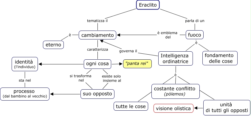 Questa Cmap, creata con IHMC CmapTools, contiene informazioni relative a: 04b Eraclito, Eraclito parla di un fuoco, cambiamento caratterizza ogni cosa, suo opposto processo (dal bambino al vecchio), Intelligenza ordinatrice è unità di tutti gli opposti, Intelligenza ordinatrice è costante conflitto (pòlemos), ogni cosa esiste solo insieme al suo opposto, fuoco è fondamento delle cose, fuoco è emblema del cambiamento, unità di tutti gli opposti visione olistica, identità (l'individuo) sta nel processo (dal bambino al vecchio), ogni cosa "panta rei", Intelligenza ordinatrice governa il cambiamento, Eraclito tematizza il cambiamento, Intelligenza ordinatrice è tutte le cose, ogni cosa si trasforma nel suo opposto, cambiamento è eterno, ogni cosa identità (l'individuo), fuoco è Intelligenza ordinatrice