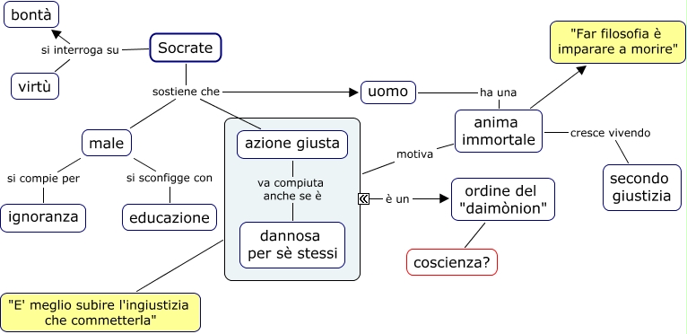 Questa Cmap, creata con IHMC CmapTools, contiene informazioni relative a: 07 Socrate - Etica, male si sconfigge con educazione, Socrate si interroga su virtù, Socrate sostiene che azione giusta, ordine del "daimònion" coscienza?, uomo ha una anima immortale, azione giusta va compiuta anche se è dannosa per sè stessi, ???? "E' meglio subire l'ingiustizia che commetterla", anima immortale motiva ????, Socrate sostiene che uomo, anima immortale cresce vivendo secondo giustizia, anima immortale "Far filosofia è imparare a morire", Socrate si interroga su bontà, male si compie per ignoranza, Socrate sostiene che male, ???? è un ordine del "daimònion"