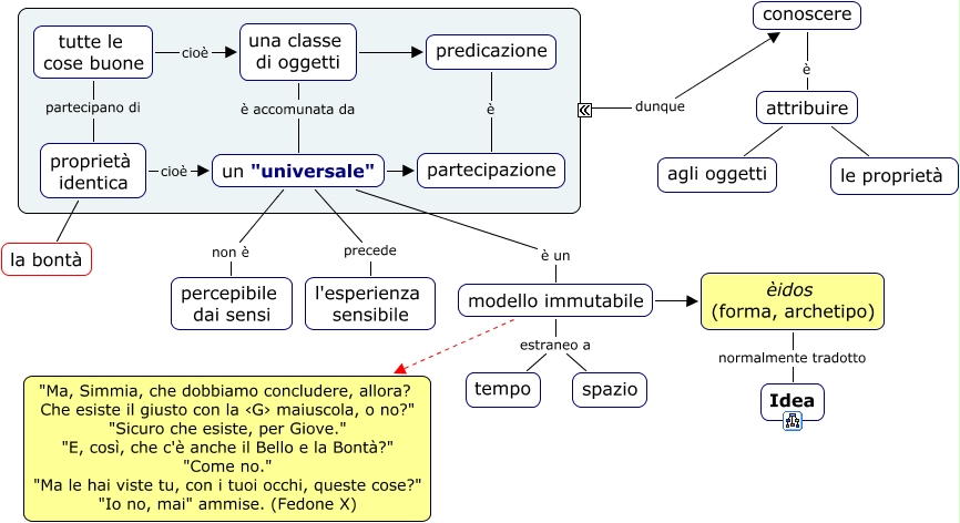 Questa Cmap, creata con IHMC CmapTools, contiene informazioni relative a: 08b Platone - Teoria delle idee, proprietà identica cioè un "universale", èidos (forma, archetipo) normalmente tradotto Idea, una classe di oggetti è accomunata da un "universale", proprietà identica la bontà, un "universale" partecipazione, una classe di oggetti predicazione, un "universale" precede l'esperienza sensibile, tutte le cose buone partecipano di proprietà identica, tutte le cose buone cioè una classe di oggetti, un "universale" è un modello immutabile, modello immutabile "Ma, Simmia, che dobbiamo concludere, allora? Che esiste il giusto con la ‹G› maiuscola, o no?" "Sicuro che esiste, per Giove." "E, così, che c'è anche il Bello e la Bontà?" "Come no." "Ma le hai viste tu, con i tuoi occhi, queste cose?" "Io no, mai" ammise. (Fedone X), un "universale" non è percepibile dai sensi, conoscere è attribuire, attribuire le proprietà, modello immutabile estraneo a spazio, attribuire agli oggetti, predicazione è partecipazione, modello immutabile èidos (forma, archetipo), modello immutabile estraneo a tempo, ???? dunque conoscere