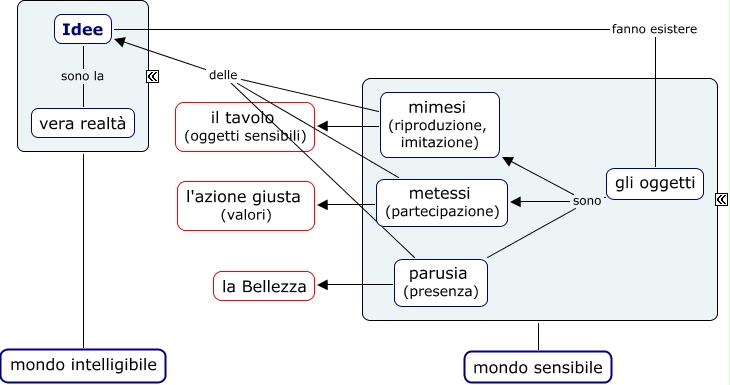 Questa Cmap, creata con IHMC CmapTools, contiene informazioni relative a: 08c Platone - Idee e mondo sensibile, metessi (partecipazione) l'azione giusta (valori), ???? mondo intelligibile, mimesi (riproduzione, imitazione) il tavolo (oggetti sensibili), gli oggetti sono mimesi (riproduzione, imitazione), Idee sono la vera realtà, ???? mondo sensibile, gli oggetti sono metessi (partecipazione), gli oggetti sono parusia (presenza), mimesi (riproduzione, imitazione) delle Idee, Idee fanno esistere gli oggetti, parusia (presenza) delle Idee, metessi (partecipazione) delle Idee, parusia (presenza) la Bellezza
