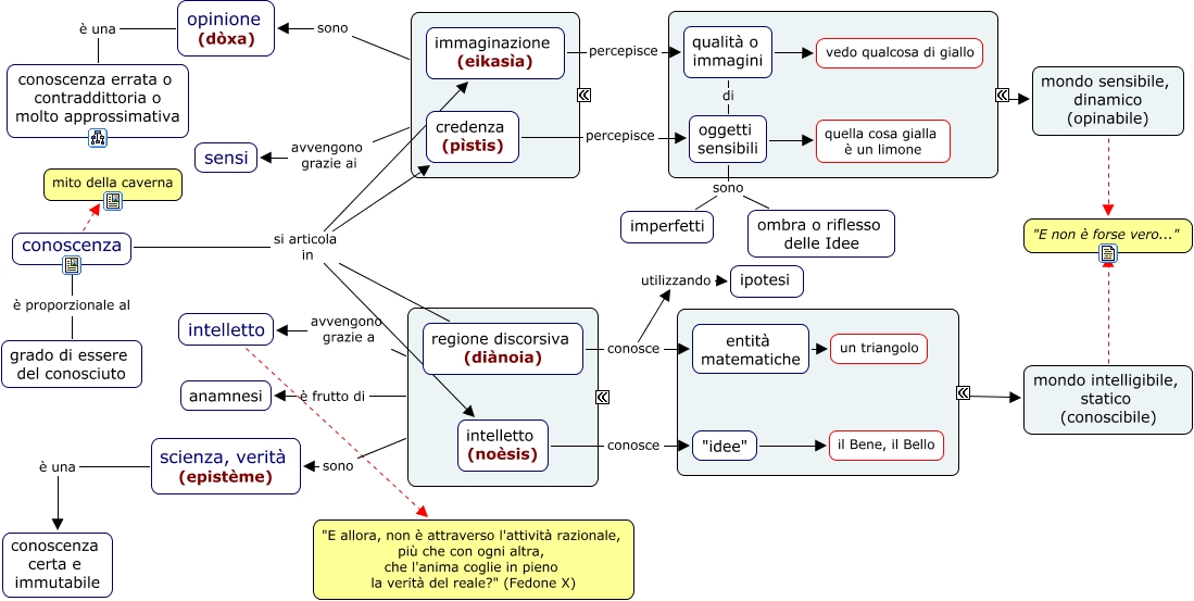 Questa Cmap, creata con IHMC CmapTools, contiene informazioni relative a: 08e Platone - Conoscenza, intelletto "E allora, non è attraverso l'attività razionale, più che con ogni altra, che l'anima coglie in pieno la verità del reale?" (Fedone X), conoscenza si articola in regione discorsiva (diànoia), conoscenza mito della caverna, conoscenza si articola in immaginazione (eikasìa), regione discorsiva (diànoia) conosce entità matematiche, oggetti sensibili sono ombra o riflesso delle Idee, conoscenza si articola in credenza (pìstis), ???? sono scienza, verità (epistème), oggetti sensibili quella cosa gialla è un limone, ???? è frutto di anamnesi, scienza, verità (epistème) è una conoscenza certa e immutabile, ???? avvengono grazie a intelletto, intelletto (noèsis) conosce "idee", mondo intelligibile, statico (conoscibile) "E non è forse vero...", "idee" il Bene, il Bello, mondo sensibile, dinamico (opinabile) "E non è forse vero...", immaginazione (eikasìa) percepisce qualità o immagini, credenza (pìstis) percepisce oggetti sensibili, conoscenza è proporzionale al grado di essere del conosciuto, qualità o immagini vedo qualcosa di giallo