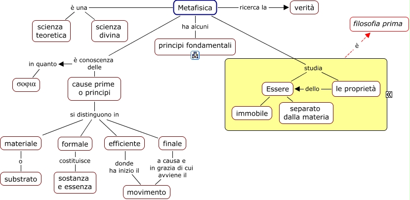 Questa Cmap, creata con IHMC CmapTools, contiene informazioni relative a: 09f Aristotele - Metafisica, ???? è filosofia prima, Metafisica è conoscenza delle cause prime o principi, Metafisica è una scienza teoretica, materiale o substrato, cause prime o principi si distinguono in formale, cause prime o principi si distinguono in efficiente, Metafisica ha alcuni principi fondamentali, le proprietà dello Essere, Essere separato dalla materia, cause prime o principi si distinguono in finale, formale costituisce sostanza e essenza, Metafisica è conoscenza delle in quanto σοφια, Metafisica ricerca la verità, cause prime o principi si distinguono in materiale, efficiente donde ha inizio il movimento, Metafisica è una scienza divina, Metafisica studia Essere, Essere immobile, finale a causa e in grazia di cui avviene il movimento, Metafisica studia le proprietà