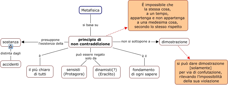 Questa Cmap, creata con IHMC CmapTools, contiene informazioni relative a: 09g Aristotele - Principi metafisici, principio di non contraddizione È impossibile che la stessa cosa, a un tempo, appartenga e non appartenga a una medesima cosa, secondo lo stesso rispetto, principio di non contraddizione può essere negato solo da sensisti (Protagora), dimostrazione si può dare dimostrazione [solamente] per via di confutazione, rilevando l’impossibilità della sua violazione, principio di non contraddizione è il più chiaro di tutti, principio di non contraddizione non si sottopone a dimostrazione, principio di non contraddizione è il fondamento di ogni sapere, principio di non contraddizione può essere negato solo da dinamisti(?) (Eraclito), principio di non contraddizione presuppone l'esistenza della sostanza, Metafisica si basa su principio di non contraddizione, sostanza distinta dagli accidenti