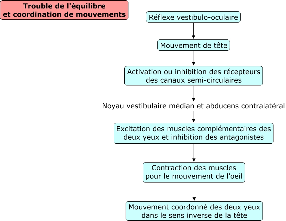Cette carte de concepts créée avec IHMC CmapTools traite de: Réflexe vestibulo-oculaire, Activation ou inhibition des récepteurs des canaux semi-circulaires Noyau vestibulaire médian et abducens contralatéral Excitation des muscles complémentaires des deux yeux et inhibition des antagonistes, Mouvement de tête Activation ou inhibition des récepteurs des canaux semi-circulaires, Excitation des muscles complémentaires des deux yeux et inhibition des antagonistes Contraction des muscles pour le mouvement de l'oeil, Contraction des muscles pour le mouvement de l'oeil Mouvement coordonné des deux yeux dans le sens inverse de la tête, Réflexe vestibulo-oculaire Mouvement de tête