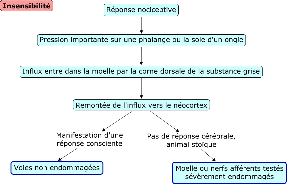 Cette carte de concepts créée avec IHMC CmapTools traite de: Réponse nociceptive, Remontée de l'influx vers le néocortex Manifestation d'une réponse consciente Voies non endommagées, Réponse nociceptive Pression importante sur une phalange ou la sole d'un ongle, Remontée de l'influx vers le néocortex Pas de réponse cérébrale, animal stoïque Moelle ou nerfs afférents testés sévèrement endommagés, Influx entre dans la moelle par la corne dorsale de la substance grise Remontée de l'influx vers le néocortex, Pression importante sur une phalange ou la sole d'un ongle Influx entre dans la moelle par la corne dorsale de la substance grise