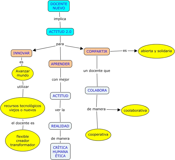 Este Cmap, tiene información relacionada con: Actitud 2.0, ACTITUD 2.0 para INNOVAR, COLABORA de manera cooperativa, recursos tecnològicos viejos o nuevos el docente es flexible creador transformador, REALIDAD de manera CRÌTICA HUMANA ÉTICA, ACTITUD ver la REALIDAD, Avanzar mundo utilizar recursos tecnològicos viejos o nuevos, COMPARTIR un docente que COLABORA, INNOVAR es Avanzar mundo, ACTITUD 2.0 para APRENDER, COMPARTIR es abierta y solidaria, COLABORA de manera coolaborativa, DOCENTE NUEVO implica ACTITUD 2.0, ACTITUD 2.0 para COMPARTIR, APRENDER con mejor ACTITUD