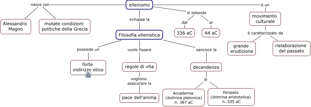 Questa Cmap, creata con IHMC CmapTools, contiene informazioni relative a: 10a Filosofia ellenistica, ellenismo sviluppa la Filosofia ellenistica, ellenismo nasce con Alessandro Magno, ellenismo è un movimento culturale, movimento culturale è caratterizzato da rielaborazione del passato, Filosofia ellenistica possiede un forte indirizzo etico, ellenismo si estende al 44 aC, ellenismo nasce con mutate condizioni politiche della Grecia, movimento culturale è caratterizzato da grande erudizione, ellenismo si estende dal 336 aC, Filosofia ellenistica vuole fissare regole di vita, regole di vita vogliono assicurare la pace dell'anima, Filosofia ellenistica sancisce la decandenza, decandenza di Peripato (dottrina aristotelica) n. 335 aC, decandenza di Accademia (dottrina platonica) n. 387 aC