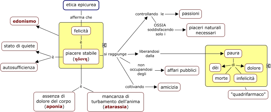 Questa Cmap, creata con IHMC CmapTools, contiene informazioni relative a: 10g Scuola epicurea - Etica, etica epicurea afferma che felicità, paura di infelicità, paura di dolore, piacere stabile (ηδονη) è stato di quiete, paura di morte, piacere stabile (ηδονη) è mancanza di turbamento dell'anima (atarassia), piacere stabile (ηδονη) è assenza di dolore del corpo (aponia), piacere stabile (ηδονη) si raggiunge coltivando amicizia, piacere stabile (ηδονη) si raggiunge controllando le passioni, piacere stabile (ηδονη) si raggiunge controllando le OSSIA soddisfacendo solo i piaceri naturali necessari, ???? edonismo, piacere stabile (ηδονη) si raggiunge non occupandosi degli affari pubblici, piacere stabile (ηδονη) è autosufficienza, piacere stabile (ηδονη) si raggiunge liberandosi dalla paura, felicità è piacere stabile (ηδονη), ???? "quadrifarmaco", paura di dèi