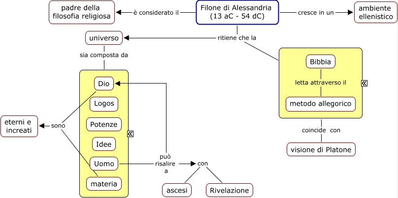 Questa Cmap, creata con IHMC CmapTools, contiene informazioni relative a: 11b Filone di Alessandria, Dio sono eterni e increati, Filone di Alessandria (13 aC - 54 dC) ritiene che la ????, Filone di Alessandria (13 aC - 54 dC) ritiene che la universo, ???? coincide con visione di Platone, universo sia composta da ????, Uomo può risalire a con Rivelazione, Bibbia letta attraverso il metodo allegorico, Filone di Alessandria (13 aC - 54 dC) è considerato il padre della filosofia religiosa, materia sono eterni e increati, Uomo può risalire a con ascesi, Uomo può risalire a Dio, Filone di Alessandria (13 aC - 54 dC) cresce in un ambiente ellenistico