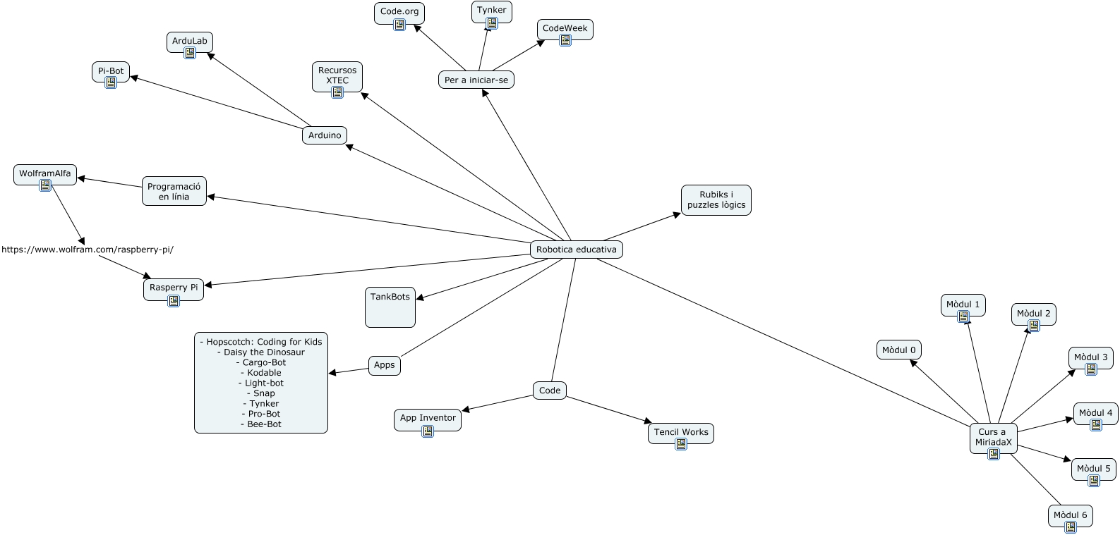 Aquest mapa conceptual conté informació relacionada amb: Robotica educativa, WolframAlfa https://www.wolfram.com/raspberry-pi/ Rasperry Pi, Robotica educativa Recursos XTEC, Per a iniciar-se Tynker, Robotica educativa Apps, Code App Inventor, Curs a MiriadaX Mòdul 2, Robotica educativa Rubiks i puzzles lògics, Robotica educativa Code, Robotica educativa Programació en línia, Per a iniciar-se Code.org, Arduino Pi-Bot, Curs a MiriadaX Mòdul 6, Curs a MiriadaX Mòdul 3, Robotica educativa TankBots, Apps - Hopscotch: Coding for Kids - Daisy the Dinosaur - Cargo-Bot - Kodable - Light-bot - Snap - Tynker - Pro-Bot - Bee-Bot, Per a iniciar-se CodeWeek, Curs a MiriadaX Mòdul 4, Curs a MiriadaX Mòdul 1, Code Tencil Works, Arduino ArduLab