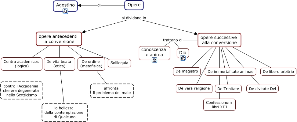 Questa Cmap, creata con IHMC CmapTools, contiene informazioni relative a: 11h Agostino - Opere e temi, opere successive alla conversione trattano di conoscenza e anima, opere antecedenti la conversione Contra academicos (logica), opere successive alla conversione De Trinitate, opere successive alla conversione trattano di Dio, Opere di Agostino, opere successive alla conversione De libero arbitrio, Contra academicos (logica) contro l'Accademia che era degenerata nello Scrtticismo, De vita beata (etica) la bellezza della contemplazione di Qualcuno, opere successive alla conversione Confessionum libri XIII, Opere si dividono in opere antecedenti la conversione, opere successive alla conversione De vera religione, opere successive alla conversione De immortalitate animae, opere antecedenti la conversione Soliloquia, Opere si dividono in opere successive alla conversione, opere successive alla conversione De magistro, opere successive alla conversione De civitate Dei, opere antecedenti la conversione De vita beata (etica), De ordine (metafisica) affronta il problema del male, opere antecedenti la conversione De ordine (metafisica)