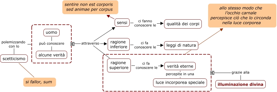 Questa Cmap, creata con IHMC CmapTools, contiene informazioni relative a: 11i Agostino - La conoscenza, ???? polemizzando con lo scetticismo, uomo può conoscere alcune verità, ragione superiore ci fa conoscere le verità eterne, ???? allo stesso modo che l’occhio carnale percepisce ciò che lo circonda nella luce corporea, ???? attraverso ragione superiore, ???? attraverso ragione inferiore, ???? grazie alla illuminazione divina, sensi ci fanno conoscere le qualità dei corpi, ???? attraverso sensi, verità eterne percepite in una luce incorporea speciale, scetticismo si fallor, sum, ragione inferiore ci fa conoscere le leggi di natura, sensi sentire non est corporis sed animae per corpus