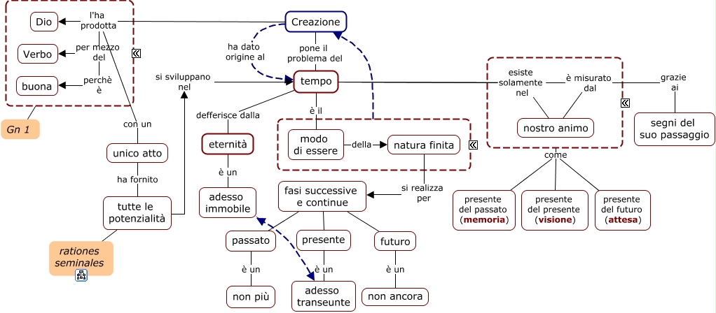 Questa Cmap, creata con IHMC CmapTools, contiene informazioni relative a: 11m Agostino - Creazione e tempo, ???? come presente del passato (memoria), modo di essere della natura finita, Creazione pone il problema del tempo, futuro è un non ancora, Creazione l'ha prodotta con un unico atto, ???? Gn 1, tempo esiste solamente nel nostro animo, tempo è il modo di essere, fasi successive e continue futuro, adesso immobile adesso transeunte, tutte le potenzialità si sviluppano nel tempo, ???? come presente del futuro (attesa), unico atto ha fornito tutte le potenzialità, fasi successive e continue presente, ???? come presente del presente (visione), passato è un non più, natura finita si realizza per fasi successive e continue, tempo è misurato dal nostro animo, tutte le potenzialità rationes seminales, Creazione l'ha prodotta Dio