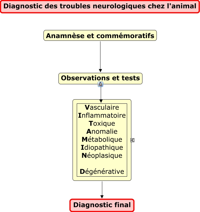Cette carte de concepts créée avec IHMC CmapTools traite de: diagnost différentiel carte départ, Anamnèse et commémoratifs Observations et tests, Causes et examens complémentaires Diagnostic final, Observations et tests Vasculaire Inflammatoire Toxique Anomalie Métabolique Idiopathique Néoplasique Dégénérative