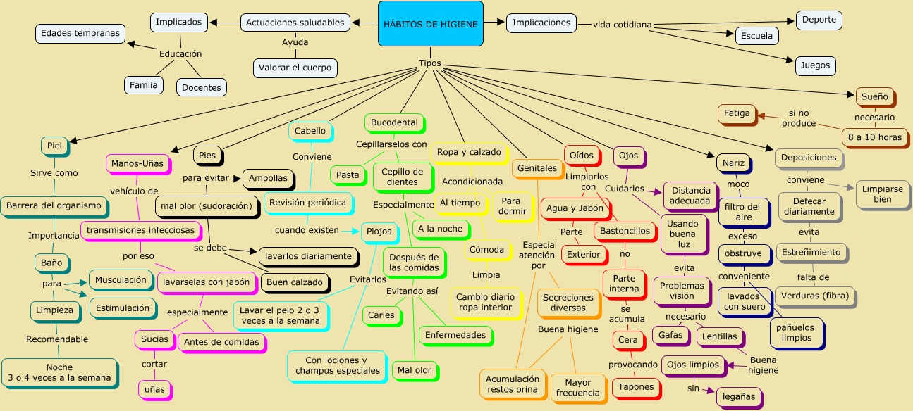 Este Cmap, tiene información relacionada con: Higiene, Oídos Limpiarlos con Agua y Jabón, HÁBITOS DE HIGIENE Tipos Genitales, Acumulación restos orina Buena higiene Mayor frecuencia, Revisión periódica cuando existen Piojos, HÁBITOS DE HIGIENE Tipos Ojos, Genitales Especial atención por Acumulación restos orina, Problemas visión necesario Gafas, Piel Sirve como Barrera del organismo, HÁBITOS DE HIGIENE Tipos Ropa y calzado, HÁBITOS DE HIGIENE Tipos Manos-Uñas, Pies para evitar Ampollas, Implicaciones vida cotidiana Juegos, Problemas visión necesario Lentillas, Piojos Evitarlos Con lociones y champus especiales, Defecar diariamente evita Estreñimiento, Ojos Cuidarlos Usando buena luz, Limpieza Recomendable Noche 3 o 4 veces a la semana, Deposiciones conviene Defecar diariamente, Ojos limpios sin legañas, Lentillas Buena higiene Ojos limpios