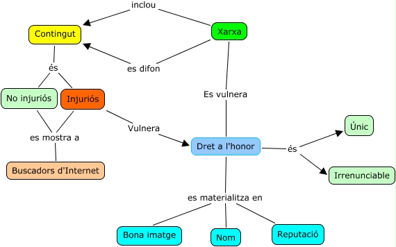 Aquest mapa conceptual conté informació relacionada amb: VulneraDretHonor, Dret a l'honor es materialitza en Reputació, Xarxa es difon Contingut, Xarxa Es vulnera Dret a l'honor, Xarxa inclou Contingut, Dret a l'honor es materialitza en Bona imatge, Dret a l'honor és Únic, Contingut és Injuriós, Contingut és No injuriós, Dret a l'honor és Irrenunciable, Dret a l'honor es materialitza en Nom, Injuriós Vulnera Dret a l'honor, No injuriós es mostra a Buscadors d'Internet, Injuriós es mostra a Buscadors d'Internet