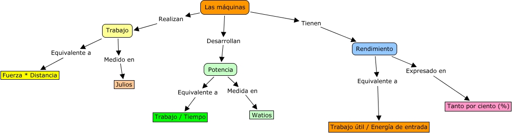 Este Cmap, tiene información relacionada con: Las_maquinas-2, Potencia Medida en Watios, Rendimiento Expresado en Tanto por ciento (%), Potencia Equivalente a Trabajo / Tiempo, Rendimiento Equivalente a Trabajo útil / Energía de entrada, Trabajo Equivalente a Fuerza * Distancia, Trabajo Medido en Julios, Las máquinas Realizan Trabajo, Las máquinas Desarrollan Potencia, Las máquinas Tienen Rendimiento