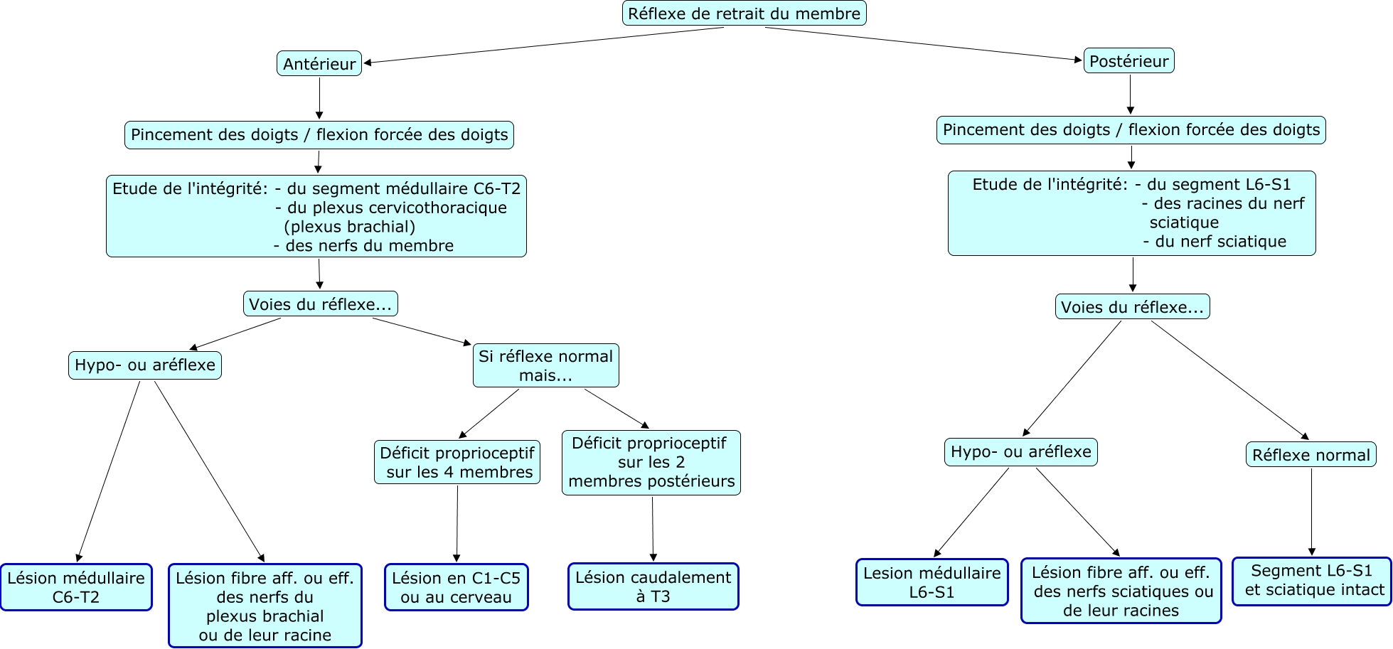 Cette carte de concepts créée avec IHMC CmapTools traite de: Sans titre, Déficit proprioceptif sur les 2 membres postérieurs Lésion caudalement à T3, Voies du réflexe... Si réflexe normal mais..., Pincement des doigts / flexion forcée des doigts Etude de l'intégrité: - du segment médullaire C6-T2 - du plexus cervicothoracique (plexus brachial) - des nerfs du membre, Réflexe de retrait du membre Antérieur, Hypo- ou aréflexe Lesion médullaire L6-S1, Pincement des doigts / flexion forcée des doigts Etude de l'intégrité: - du segment L6-S1 - des racines du nerf sciatique - du nerf sciatique, Etude de l'intégrité: - du segment L6-S1 - des racines du nerf sciatique - du nerf sciatique Voies du réflexe..., Postérieur Pincement des doigts / flexion forcée des doigts, Voies du réflexe... Hypo- ou aréflexe, Réflexe de retrait du membre Postérieur, Hypo- ou aréflexe Lésion fibre aff. ou eff. des nerfs sciatiques ou de leur racines, Réflexe normal Segment L6-S1 et sciatique intact, Déficit proprioceptif sur les 4 membres Lésion en C1-C5 ou au cerveau, Voies du réflexe... Hypo- ou aréflexe, Hypo- ou aréflexe Lésion fibre aff. ou eff. des nerfs du plexus brachial ou de leur racine, Voies du réflexe... Réflexe normal, Hypo- ou aréflexe Lésion médullaire C6-T2, Etude de l'intégrité: - du segment médullaire C6-T2 - du plexus cervicothoracique (plexus brachial) - des nerfs du membre Voies du réflexe..., Antérieur Pincement des doigts / flexion forcée des doigts, Si réflexe normal mais... Déficit proprioceptif sur les 2 membres postérieurs