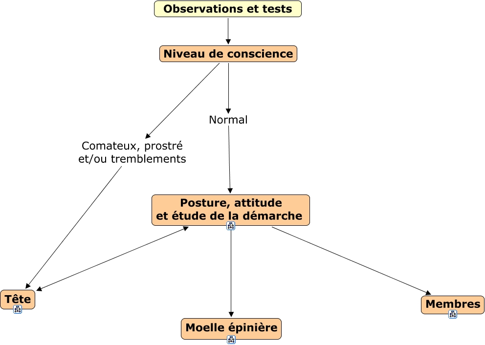 Cette carte de concepts créée avec IHMC CmapTools traite de: observations et tests corre', Posture, attitude et étude de la démarche Membres, Posture, attitude et étude de la démarche Moelle épinière, Posture, attitude et étude de la démarche Tête, Observations et tests Niveau de conscience, Niveau de conscience Normal Posture, attitude et étude de la démarche, Niveau de conscience Comateux, prostré et/ou tremblements Tête