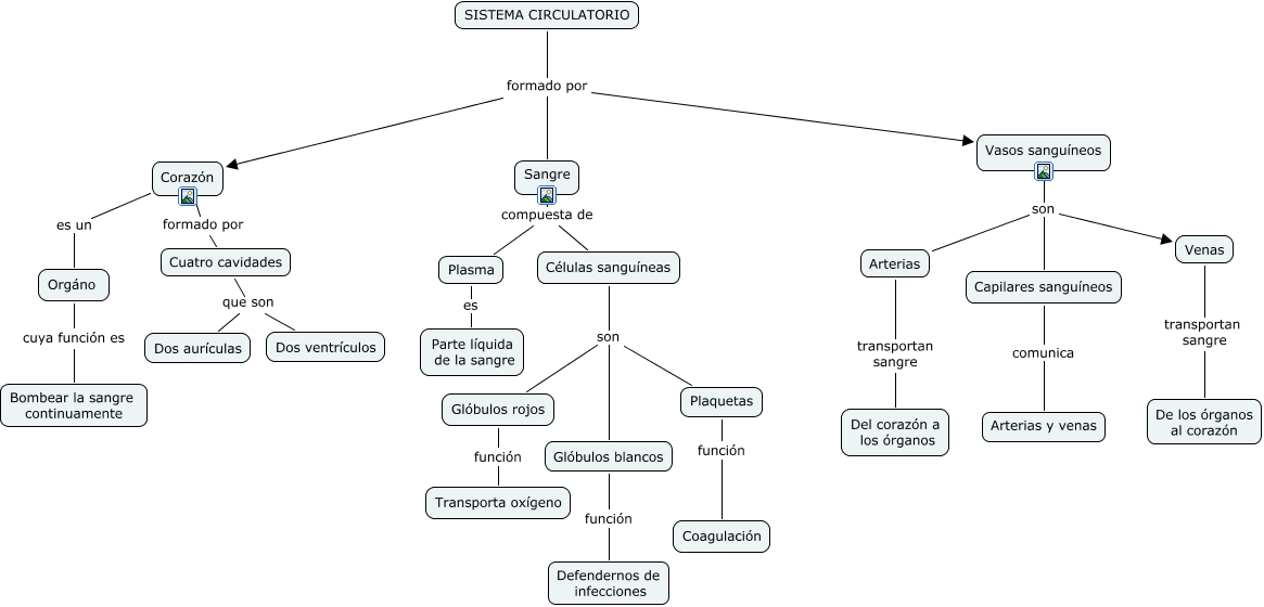 Este Cmap, tiene información relacionada con: Sistema circulatorio, SISTEMA CIRCULATORIO formado por Vasos sanguíneos, Células sanguíneas son Glóbulos rojos, Células sanguíneas son Glóbulos blancos, Vasos sanguíneos son Capilares sanguíneos, Vasos sanguíneos son Venas, Capilares sanguíneos comunica Arterias y venas, Células sanguíneas son Plaquetas, Glóbulos rojos función Transporta oxígeno, Cuatro cavidades que son Dos ventrículos, Vasos sanguíneos son Arterias, Sangre compuesta de Células sanguíneas, Plasma es Parte líquida de la sangre, SISTEMA CIRCULATORIO formado por Corazón, Venas transportan sangre De los órganos al corazón, SISTEMA CIRCULATORIO formado por Sangre, Orgáno cuya función es Bombear la sangre continuamente, Sangre compuesta de Plasma, Arterias transportan sangre Del corazón a los órganos, Cuatro cavidades que son Dos aurículas, Corazón es un Orgáno