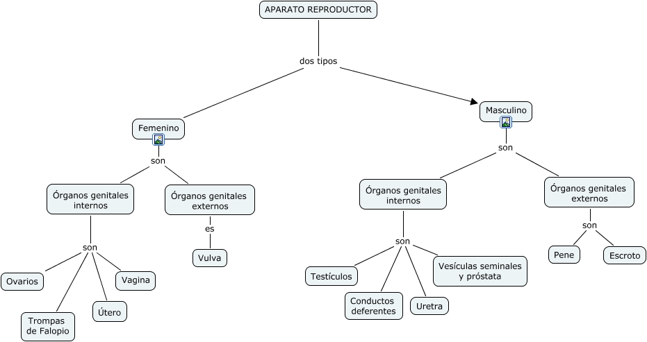Este Cmap, tiene información relacionada con: Aparato reproductor, Órganos genitales internos son Ovarios, Órganos genitales internos son Útero, Órganos genitales internos son Trompas de Falopio, Órganos genitales externos son Pene, Masculino son Órganos genitales externos, APARATO REPRODUCTOR dos tipos Femenino, APARATO REPRODUCTOR dos tipos Masculino, Órganos genitales internos son Testículos, Órganos genitales internos son Vesículas seminales y próstata, Órganos genitales internos son Vagina, Femenino son Órganos genitales externos, Órganos genitales internos son Conductos deferentes, Órganos genitales externos es Vulva, Masculino son Órganos genitales internos, Femenino son Órganos genitales internos, Órganos genitales internos son Uretra, Órganos genitales externos son Escroto