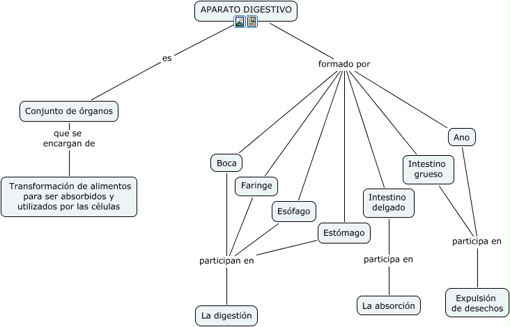 Este Cmap, tiene información relacionada con: Aparato digestivo, APARATO DIGESTIVO formado por Intestino grueso, APARATO DIGESTIVO formado por Ano, Esófago participan en La digestión, APARATO DIGESTIVO formado por Intestino delgado, APARATO DIGESTIVO formado por Estómago, APARATO DIGESTIVO formado por Boca, Boca participan en La digestión, Ano participa en Expulsión de desechos, APARATO DIGESTIVO formado por Esófago, APARATO DIGESTIVO es Conjunto de órganos, Conjunto de órganos que se encargan de Transformación de alimentos para ser absorbidos y utilizados por las células, Intestino grueso participa en Expulsión de desechos, Estómago participan en La digestión, Intestino delgado participa en La absorción, APARATO DIGESTIVO formado por Faringe, Faringe participan en La digestión