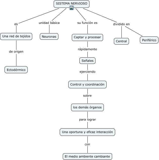 Este Cmap, tiene información relacionada con: Sistema nervioso, los demás órganos para lograr Una oportuna y eficaz interacción, SISTEMA NERVIOSO dividido en Central, Captar y procesar rápidamente Señales, Señales ejerciendo Control y coordinación, Una red de tejidos de origen Ectodérmico, SISTEMA NERVIOSO dividido en Periférico, SISTEMA NERVIOSO es Una red de tejidos, SISTEMA NERVIOSO su función es Captar y procesar, Una oportuna y eficaz interacción con El medio ambiente cambiante, SISTEMA NERVIOSO unidad básica Neuronas, Control y coordinación sobre los demás órganos