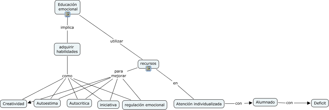 Este Cmap, tiene información relacionada con: Educación emocional, Educación emocional utilizar recursos, Educación emocional implica adquirir habilidades, recursos para mejorar Creatividad, adquirir habilidades como iniciativa, recursos para mejorar Autoestima, Atención individualizada con Alumnado, adquirir habilidades como Creatividad, recursos para mejorar Autocritica, recursos para mejorar regulación emocional, adquirir habilidades como Autoestima, Alumnado con Deficit, adquirir habilidades como Autocritica, recursos para mejorar iniciativa, recursos en Atención individualizada, adquirir habilidades como regulación emocional